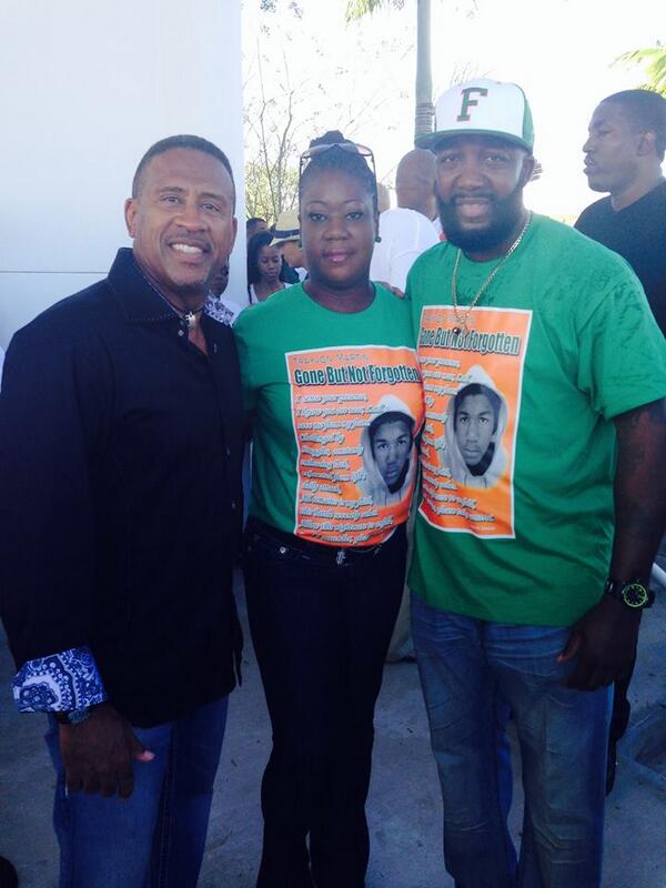 Baisden is below with Trayvon Martin’s parents Sybrina Fulton and Tracy Martin donning “Gone But Not Forgotten” tees with a hooded Trayvon pic underneath at the walk.