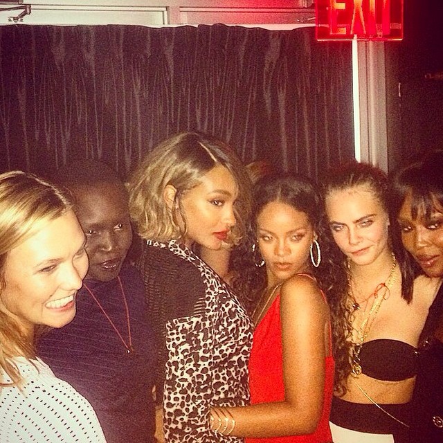 dunnandfriendsAnd rallied famous friends–Rihanna, Naomi Campbell, Alek Wek, Karlie Kloss and Cara Delevingne–to her “Cell for Gratitude” launch during New York Fashion Week.