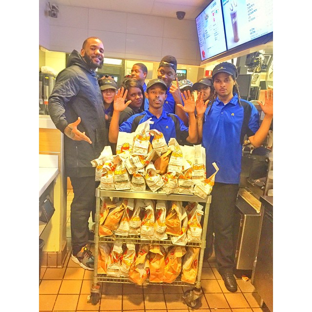 Look ma, no hands. The Game and McDonald's workers in Ferguson. Image Courtesy: LOS ANGELES CONFIDENTIAL instagram