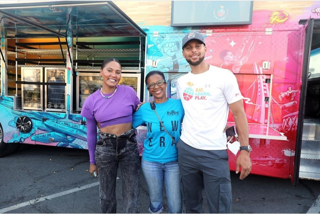 Ayesha and Stephen Curry rolled the real magic school bus (minus Ms Frizzle)—that acts as bookstore, basketball court and food truck—into Oakland on Wednesday to cheering kiddos.